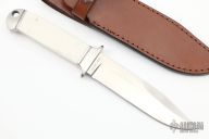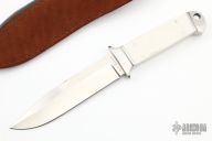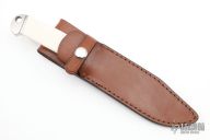 This Integral Chute Knife by AG Russell features a satin finished blade with false top edge, .209" blade stock and 1.163" blade depth, full integral tapered tang construction. The handle has faux ivory scales and stainless steel pins. Comes with a brown leather sheath. Excellent condition.