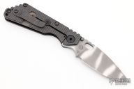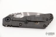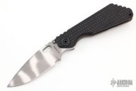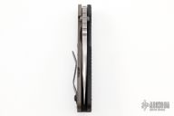 This SNG framelock folder by Mick Strider features a Ghost Stripped drop point blade and a dimple pattern black aluminum and flamed titanium frame and tip up titanium clip. Includes a "Lock Bar Stabilizer" for maximum reverse lock retention. Nice detent, lockup and blade seating. Has a couple light scuffs, otherwise excellent condition.