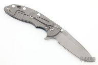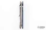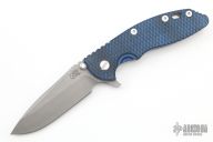 This XM-18 Flipper by Rick Hinderer Knives features a 3.5" working finished blade, notched thumbrest and flipper, dual thumbstuds. The handle has a black/blue G-10 scale, and working finished titanium handle/clip. Clip can be mounted for tip up or down carry. Nice lockup, seating, and detent. Comes with original box and extra hardware. Excellent condition.