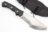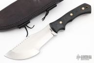 This is a WSK Tracker made by Dave Beck. It features a hand rub satin finished blade with self-cleaning sawteeth on blade spine. Black linen micarta scales. Full tapered tang construction with .235" blade stock and 2.420" blade depth. Set includes original Dave Beck black leather sheath. Tracker is stamped "BECK" on ricasso. Excellent condition.