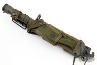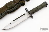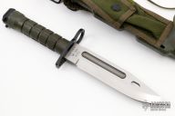 This M9A1 Phrobis Int'l features a bead blasted spear point blade with sawteeth on the spine and a large fuller, .235" blade stock and 1.420" blade depth, hidden tang construction. The handle has a black steel guard and green plastic grip and can be removed from the handle for cleaning. Comes with original green sheath. Has some sheath marks, otherwise excellent condition.