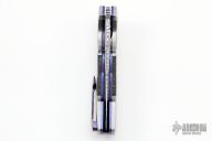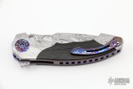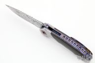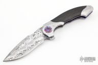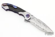 This Archangel from Todd Fischer Sr features a Vinland Pattern Damasteel blade with false top edge, notched thumbramp and flipper. The handle has Damasteel bolsters, Blackwood carbon fiber scales, anodized titanium liners, notched mokuti backspacer, mokuti tip up clip and pivot collars. Blade is centered when closed and locks up with no play. Nice crisp detent. Very smooth action thanks to Mr. Fischer's bearing system. Comes with a nylon zippered case. Excellent condition. The only visible screw/hardware on the entire knife is the pivot, everything else is hidden. Very impressive.