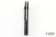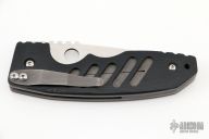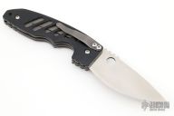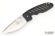 This linerlock folder by Steve Ryan features a chisel ground satin finish blade with notched thumbrest and thumbhole. The handle has black G-10 scales, bead blasted titanium clip and liners, black linen micarta backspacer. Nice lockup and detent, blade is off center. Has some scuffs and scratches, otherwise good condition.