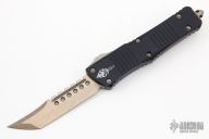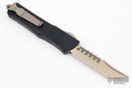 This Combat Troodon by Microtech Knives features a bronzed Hellhound blade with satin flats. The handle has a black aluminum frame with tip down bronzed stainless steel clip and hardware. Comes with original box and papers. 07/2018. Excellent condition.