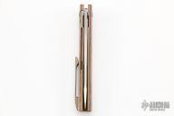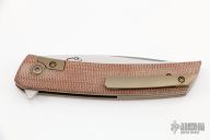 This F22 was designed by Jared Oeser, manufactured by Reate Knives and features Lee Williams Kickstop.  This knife features a satin finished blade with a notched flipper tab.  The handle has brown micarta scales with a bronzed titanium backspacer, tip up pocket clip and escutcheon. The knife opens with the use of Lee Williams' Kick Stop flipper.  Includes the original box.  New from Maker!