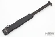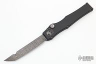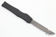 This Microtech Halo III has a Devin Thomas "Spirograph" Damascus blade. The anodized aluminum frame has a stainless steel firing button with an Abalone insert. The single action mechanism launches the blade straight out the front of the handle. The charging handle is used to retract the blade. Strong action.  Includes a padded velcro case.