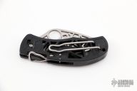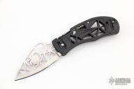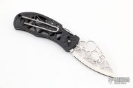 This Q Knife front-lock folder by Spyderco has a skeletonized satin finished stainless steel fully serrated blade with unique, clip-style front lock. Handle is black skeletonized polymer with 4-way reversible clip and lanyard hole. Excellent condition.