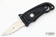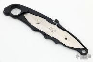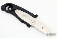 This knife has two blades, one plain edge and one serrated. The handle pivots in the middle exposing the blade, or covering the blade when not in use. Comes with original box and papers. Has some light scuffs and scratches, great condition otherwise.