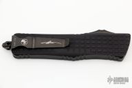 The Combat Troodon is a precision-made, out-the-front tactical knife. It is 25% larger than the flagship, the Troodon. It brings the slender handle, contoured shape, radical design elements, and a sophisticated internal mechanism that improves operational functionality and reliability to a larger scale. The Combat Troodon is designed for a broad spectrum of utility and close quarter combat applications. Has a fluted DLC standard tanto blade. Black frag pattern aluminum handle with black hardware, tip down stainless steel clip and nickel boron internals. Comes with original box and papers. Excellent condition. Dated 12/2020 and S/N 178.