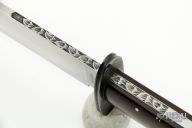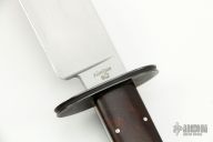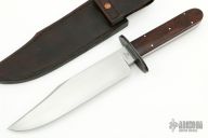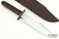 This Skinner by Master Smith John Horrigan features a hand rubbed satin finished blade with false top edge and engraved blade spine and tang, .237" blade stock and 1.607" blade depth, full tang construction. The handle has a blued steel fluted guard, desert ironwood burl scales and stainless pins. Comes with a beautiful hand tooled brown leather sheath. Has a fwe lights scratches, otherwise excellent condition. Comes with a zippered case.