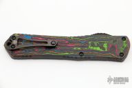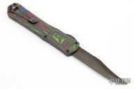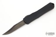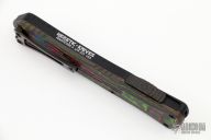 This Manticore-X by Heretic Knives features a black DLC bowie blade with notched thumbrest. The handle has a black aluminum frame with 80's camo carbon fiber back cover, black stainless steel hardware and black tip down clip, and titanium thumbslide. Comes with original box, papers and sample tube of OTF Lube. S/N 023. Excellent condition.