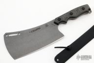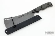 While this cleaver can be used for heavier veggie chopping tasks, it's primarily made to cut meat. With a blade length of 6” and a thickness of 3/16”, this cleaver has the weight and capability to help you take care of whatever meat processing you may encounter. It's made of 1095 high carbon steel and has TOPS' new Sniper Gray finish. It comes with a Kydex Blade cover that is held in place with an elastic shock cord.