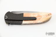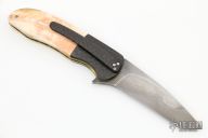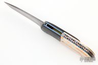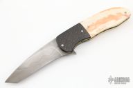 This knife by Theuns Prinsloo features a hand rub satin finished tanto blade with nice hamon and flipper. The handle has lightning strike carbon fiber dovetailed bolsters, warthog ivory scales, anodized and fileworked titanium liners and a heat colored stainless steel backspacer with filework, and a lightning strike carbon fiber tip down clip. Nice lockup and blade seating. Rides on bearings. Has a couple light scratches, otherwise excellent condition.