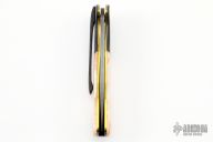 Before he became a full-time knifemaker, he was a headmaster of a school for students with learning disabilities. He seriously committed to making his first knife after his 16 year old son passed away in 1994. He became a full-time maker in 1996 and is a Knife Guild of South Africa member. Theuns never makes the same knife twice. Some knives may use the same materials or have a shape that is somewhat similar, but what separates a Theuns Prinsloo knife is in the details. I heard that when Michelangelo was painting the Sistine Chapel there were places he painted that would never be seen by human eyes, but Michelangelo painted them anyway because God would see them. The next time you pick up one of Theuns Prinsloo’s folding knives, open it. Look inside the recess where the blade seats and prepare to be amazed. Theuns painstakingly makes an etching on the inside each of the backspacers that usually depicts an African bushman scene with the backdrop being the mountain that is visible from his backyard.