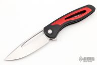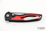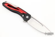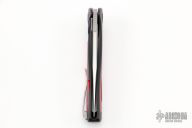 This Apex Flipper from Brian Nadeau features a satin finished blade with a thumbhole, flipper and notched thumbrest. The handle has a black tumbled titanium frame with red aluminum inlays, satin titanium tip up clip. Rides on bearings, nice detent, lockup and blade seating, stainless lockface insert. Comes with original box and papers. Excellent Condition.
