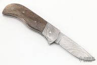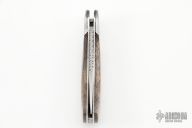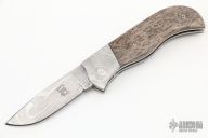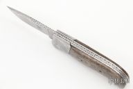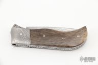 This Bolster Release automatic from Rendon Griffin features a Damascus blade with fileworked spine. The handle is comprised of Damascus dovetailed bolsters, fileworked Damascus backspacer, bone scales, stainless steel liners. Has a few light scratches, otherwise excellent condition. Comes with a zippered case.