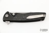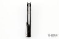 This Evo from Brian Nadeau features a satin finished harpoon blade with a fuller and notched thumbrest. The handle has a black PVD titanium frame with marble carbon fiber inlays, satin titanium tip up clip. Rides on bearings, nice detent, lockup and blade seating, stainless lockface insert. Light scratches are visible on the pocket clip otherwise the knife is in excellent condition.