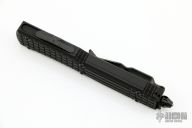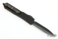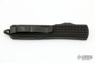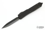 This Ultratech OTF automatic by Microtech features a D/E full serrated black DLC fluted blade. Black aluminum frag pattern frame with black tip down stainless steel clip. Dated 10/2021 and s/n 090. DLC Hardware. Excellent condition. Includes original box and papers.