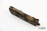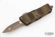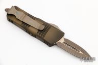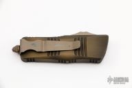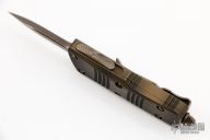 This Troodon Mini OTF automatic by Microtech knives features a bronze apocalyptic finished double edged blade, and a bronzed apocalyptic aluminum handle with bronze apocalyptic finished hardware, tip down clip, and glass breaker. S/N 075 . Dated 07/2021. Comes with original box and papers. Excellent condition.