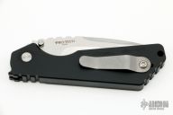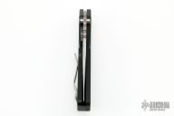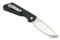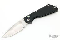 This Pro-Strider SNG by Pro-Tech and Strider Knives features a hand ground mirror finished blade with notched thumbrest. The handle has a black canvas micarta and black aluminum frame with stonewash finish stainless steel tip up. Black Lip Pearl inlaid release button. Has a safety. Comes with original box and papers. Excellent condition.