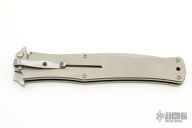 This Madd Maxx 7" Flipper is a Darrel Ralph Design executed by HTM Knives. It features a stonewashed bayonet ground blade with false top edge, fullers. Flipper and dual thumb studs. The handle is comprised of a matte finished titanium frame with machined carbon fiber overlays over barrel spacers, stainless steel pocket clip is positioned for tip down carry. Lanyard hole in pommel. Comes with a zippered case. Excellent condition.