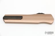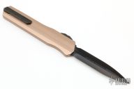 The Cypher D/E fautomatic features a DLC stonewashed finished double edged blade. The handle is comprised of tan two-tone hefted aircraft alloy with DLC accents and hardware. Titanium tip down pocket clip. S/N 012 and dated 03/2018. Includes original zippered case. Excellent condition.