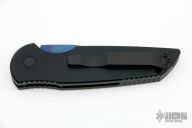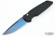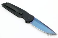 This TR-3 SB from Pro-Tech Knives features a drop point Sapphire Blue finished blade with swedge. The handle has a black aluminum handle with a black stainless steel tip up clip, abalone inlaid push butt, all black hardware. Comes with original box and papers. Excellent condition.