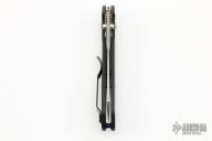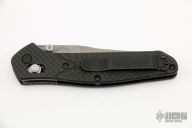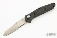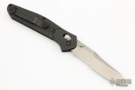 This 940S-1 Obsorne Axis Lock Folder by Benchmade has a stonewashed clip point, partially serrated blade with swedge and dual thumb studs. Handle is carbon fiber with blue anodized aluminum stand-offs and black stainless steel tip up clip (RH/LH carry). Centered blade and smooth action. Comes with original packaging. Excellent Condition.