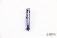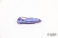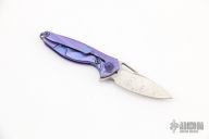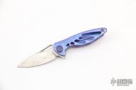 This Hummingbird Flipper by Rike Knife features a Damasteel blade with thumbhole, notched thumbrest and flipper. The handle has an anodized and milled titanium frame with matching tip up clip and a blue anodized titanium backspacer, has stainless lockface insert. Nice detent, lockup and blade seating. Rides on caged bearings. Excellent condition.
