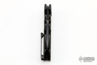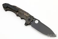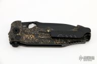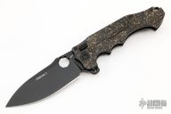 This Pitboss 1 by Andre De Villiers features a drop point blade with thumbhole, notched thumbrest and flipper. It swings smoothly on a ball-bearing system and has both a thumb hole and flipper opener; it can also be opened or closed with a flick of the wrist when the inlaid button lock is held down. A safety switch on the side allows the blade to be locked in the closed position or provides an additional level of safety in the open position. It has a milled copper shred carbon fiber handle with satin hardware. A jimped, anodized titanium backstrap with a lanyard hole and a tip-up, titanium pocket clip with hidden screws. "69-2021" on the ricasso. Comes with a soft case. Excellent condition.