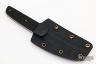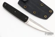 This Kwaito from Bud Nealy features a hand rub satin finished  blade with notched thumb and index finger grooves, .109" blade stock and .761" blade depth, full tang construction. The handle has black G-10 scales. Comes with a magnetic kydex sheath. Numbered 6804. Excellent condition.