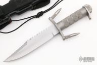 This is an early Buckmaster 184, made prior to full blade being marked with BUCKMASTER and while it was patent pending, hard to find. Has a clip point blade with serrated top edge and saw teeth on spine, .287" blade stock and 1.488" blade depth. The handle has a stainless steel guard, knurled handle and removable butt cap. Comes with original sheath that includes original grappling hooks and lanyard ring. Has some light scuffs, otherwise excellent condition. Made between November 1984 - July 1985. Comes with original box and papers.