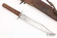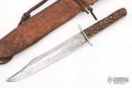 This Antique Bowie by John Newton & Co. features a clip point blade with 3 inch false edge, .175" blade stock and 1.196" blade depth, full tapered tang construction. The ricasso marked John/Newton & Co./Sheffield, reverse with frog mark. Oval German silver guard with stag scales. Brown leather scabbard with rivets. Has scratches and patina, has been resharpened, small chip missing from one of the scales, good condition for its age.