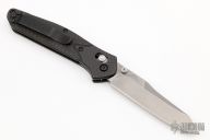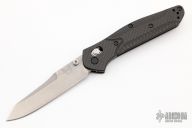 The Warren Osborne designed Benchmade 940 is a popular knife for good reason. It's a comfortable everyday carry knife with its slim design, great ergonomics and lightweight. The 940-1 has a premium CPM-S90V steel blade with a plain edge and a stonewash finish. The carbon fiber handle has stainless steel liners and blue anodized aluminum barrel spacers. The AXIS lock and reversible pocket clip make the knife usable for right and left-handers. Includes the original box and papers.  Excellent Condition.