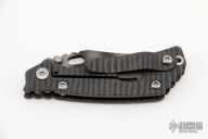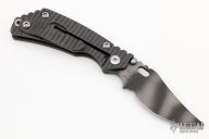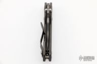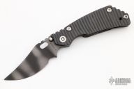 This PT Persian by Mick Strider features a tiger striped blade with notched thumbrest and thumbhole. The handle has a flame finished titanium frame with matching tip up clip. New from maker.