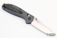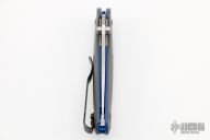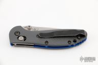 This 556-1 Mini Griptilian by Benchmade features a tumble finished clip point blade with swedge, dual thumb studs and notched thumb rest. The handle has textured gray G10 scales over blue liners, stainless steel sub frame and blue anodized aluminum barrel spacers. The black coated, stainless steel, deep carry, tip up clip is reversible for right or left hand carry. Lanyard hole in pommel. Includes original box and papers.  Excellent Condition.