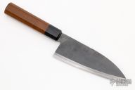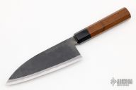 The Debabocho is a heavy knife traditionally used for filleting fish. The blade is Stainless Clad Aogami Super Steel (NAS) which is a high-carbon steel alloy with vanadium and is ground on both sides. As with all of Takeda's knives, it has a strong sharp edge. The octagon shaped wood handle is easy to hold. 162 mm cutting edge, .250" blade stock and 2.110" blade depth. Brand new from maker. Comes with original box.