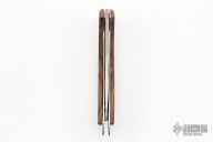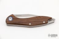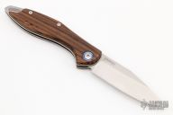 This MKM Fara model sports a satin Bohler M390 blade and Santos Wood handle scales with satin hardware and a blue pivot collar.