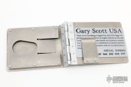 Titanium wallet by Gary Scott for Strider Knives. Has money clip and card slot. Has scuffs and scratches, great user condition otherwise. 3.75"x2.75", 7.75" Open.