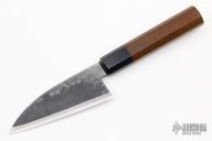 The Banno-KoDeba knife is traditionally used as a paring knife or all-purpose small kitchen knife. The blade is Stainless Clad Aogami Super Steel (NAS) which is a high-carbon steel alloy with vanadium. As with all of Takeda's knives, it has a strong sharp edge. The octagon shaped wood handle is easy to hold. 110mm cutting edge. Brand new from maker.