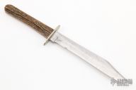 This anitque bowie by Edwin Murray Dickinson of Sheffield England features a clip point blade with false top edge, .165" blade stock and .884" blade depth, full tang construction. The handle has nickel silver guard, stag scales. Has scratches and patina, has been resharpened, otherwise good condition for a 100 year old knife.