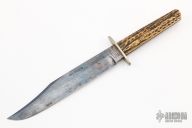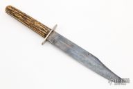 This anitque bowie by Alfred Williams of Sheffield England features a clip point blade with false top edge, blade has been blued, .158" blade stock and 1.105" blade depth, full tang construction. The handle has nickel silver guard, jigged bone scales. Has scratches, has been resharpened, otherwise good condition for a 100 year old knife.