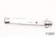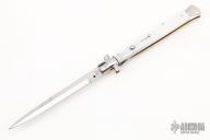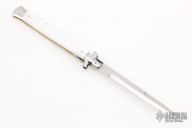This Swivel Bolster Auto by Edgeco features a polished spear point blade with nail nick. The handle has stainless steel bolsters and butt, pearlex scales, brass liners. Has some light scratches, otherwise excellent condition. Comes with a black leather slip sheath.