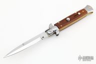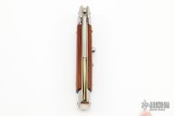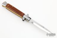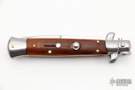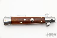 This Swivel Bolster Auto has a mirror polished stainless steel spear point blade. The handle is composed of a steel front and rear bolsters, brass liners all complemented by cocobolo scales. Excellent Condition. Comes with a brown leather slip sheath.