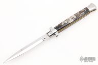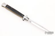 This 9" Picklock by Frank Beltrame features a polished bayonet ground blade with false top edge. The handle has stainless steel bolsters, front and rear, buffalo horn scales, brass liners, stainless spring. Excellent condition. Comes with a black leather slip sheath.