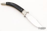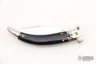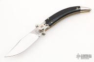 This Diana lockback auto by AGA Campolin features a mirror polished blade, mirror polished nickle silver bolsters and buffalo horn scales, brass liners. Nice function, strong firing and lock up. Excellent condition. Comes with black leather sheath. Has 16 and 12 gauge shotgun shell puller bolsters.