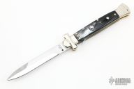 This lockback Auto by AGA Campolin has a mirror polished stainless steel spear point blade with false top edge. Handle is buffalo horn with mirror polished nickel silver bolsters, brass liners,stainless steel back spacer. Has a few light scratches, otherwise excellent condition. Comes with original box and leather slip sheath.