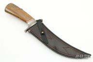 This Persian Fighter by Anders Hogstrom features a Damasteel blade with a false top edge, .218" blade stock and 1.577" blade depth, hidden tang construction. The handle has textured sterling silver guard, textured bronze spacer, fossil walrus ivory grip with heirloom fit up. Comes with a hand tooled black leather sheath and velcro case. New condition. Truely stunning.