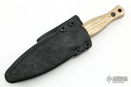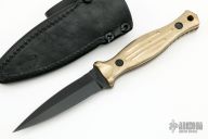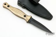 This Galvo Dagger by Les George features a black ceracoated double-edged blade with .170" blade stock and .894" blade depth, full tang construction. The handle has bronze scales with fullers and a lanyard hole. Comes with a black leather sheath by Chatanooga Leatherworks. Comes with original box. New from maker, Les George, the man, the myth, the legend.