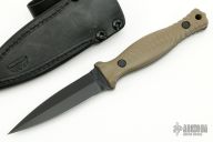 This Galvo Dagger by Les George features a black ceracoated double-edged blade with .170" blade stock and .894" blade depth, full tang construction. The handle has FDE cerakoted aluminum scales with Morph milling pattern and a lanyard hole. Comes with a black leather sheath by Chatanooga Leatherworks. Comes with original box. New from maker, Les George, the man, the myth, the legend.